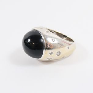 1 100 / 1 300 €Bague : en or gris 750 mil. Ornée d'un pierre cabochon noire, ponctuée de petits diamants brillantés. Travail français. (TDD : 57) (Largeur : 1,3 cm environ). 22 g. brut.
