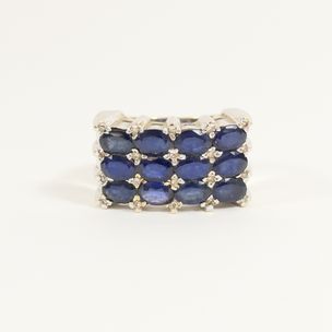 700 / 800 €Bague : en or gris 750 mil. Ornée de saphirs ovales dont les griffes sont ornées de petits diamants brillantés. Travail français. (Largeur : 1,4 cm environ) (TDD : 56) (égrisures) (légère déformation)(rhodiage à prévoir). 14,7 g. brut.