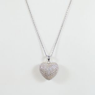 300 / 400 €Collier : en or gris 750 mil. À maille forçat limée retenant un pendentif cœur orné de diamants 16/16 (égrisure, éclats). (Longueur : 45 cm environ) (Pendentif : 2,2 cm environ). 6,8 g. brut.