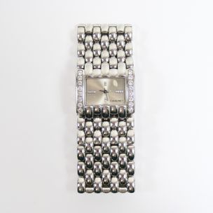 300 / 600 €CHAUMET : "Khésis". Montre-bracelet en acier, Boîtier rectangulaire (Diam. : 3 cm environ) à lunette partiellement diamantée. Cadran nacré à index diamantés. Bracelet en acier à boucle déployante. (Largeur : 3 cm environ, Longueur : 17 cm environ). Signée.