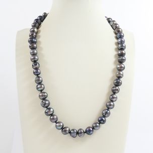 200 / 300 €Collier de perles : de cultures grises (Diam. : 9,3 mm environ). Fermoir en or 750 mil. (Longueur : 50 cm environ) (perles cerclées et piquées). 64,4 g. brut.