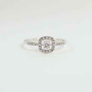 100 / 140 €Bague : en or gris 750 mil. À chaton carré orné d'un diamant brillanté d'environ 0,05 carat, entouré de petits diamants 16/16. (Largeur : 0,6 cm environ) (TDD : 49). 1,4 g. brut.