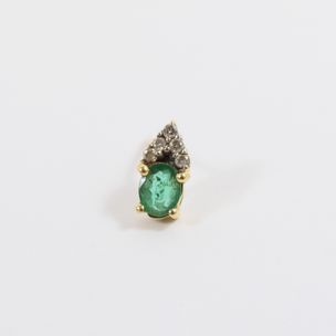 20 / 40 €Puce d'oreille : en or 750 mil. Ornée d'une émeraude ovale sertie griffe, rehaussée de petits diamants brillantés. (Longueur : 0,9 cm environ) (Manque système, tige déformée). 0,7 g. brut.