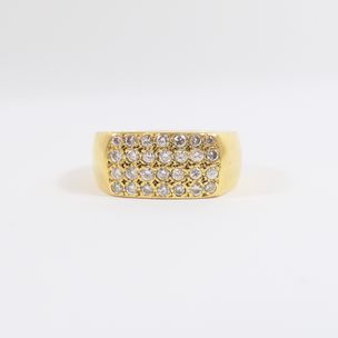 400 / 500 €Bague : en or 750 mil. À plateau rectangulaire pavé de diamants brillantés. (Largeur : 0,8 cm environ) (TDD : 55) (Légèrement déformée). 7,4 g. brut.