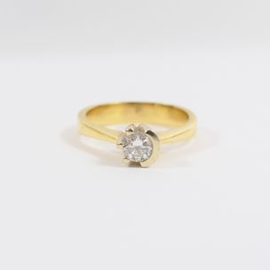 300 / 400 €Bague solitaire : en or 750 mil. Ornée d'un diamant d'environ 0,3 carat en serti mi-clos, mi griffe. (TDD : 57). 5,8 g. brut.