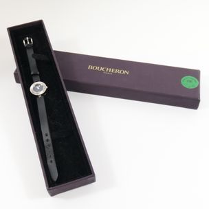200 / 400 €BOUCHERON : modèle "Ma jolie", montre-bracelet. Boîtier rond en acier, lunette cannelée, (Diam. : 2 cm environ. Cadran noir à un index diamanté. Mouvement à quartz. ). Bracelet en cuir à boucle ardillon. (Longueur : 14 à 17 cm environ). Signé et numéroté. avec son écrin.
