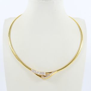 1 800 / 2 000 €Collier : en or 750 mil. À maille oméga centrée d'un motif enlacé serti de diamants brillantés. Fermoir cliquet. (Longueur : 43 cm environ). 33,4 g. brut.