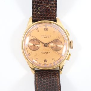 200 / 300 €OLYMPIC : Montre sur bracelet, Boîtier rond en or 750 mil. (Diam. : 3,5 cm environ). Chronographe. Cadran cuivre à chiffres arabes et index, chemin de fer pour les minutes. Double sous compteur. Mouvement mécanique à remontage manuel. Bracelet en cuir à boucle ardillon en métal doré. (Usé, rousseur) (Tour de poignet : 17 à 20 cm environ). 41,1 g. brut.