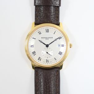 800 / 1 000 €FREDERIQUE CONSTANT : Montre sur bracelet en or 750 mil. Boîtier rond à lunette godronnée. (Diam. : 4 cm environ). Cadran gris à chiffres romains. Guichet pour les secondes et un guichet dateur à 3 H. Signée et numérotée. Mouvement à quartz. Bracelet en cuir marron à boucle ardillon en métal doré. (Tour de poignet : 19 à 22 cm environ).