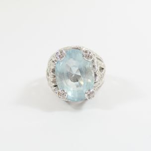 650 / 750 €Bague : en or gris 750 mil. Ornée d'un aigue marine ovale entourée de petits diamants brillantés. Travail français. (Largeur : 1,6 cm environ) (TDD : 55). 13,7 g. brut.