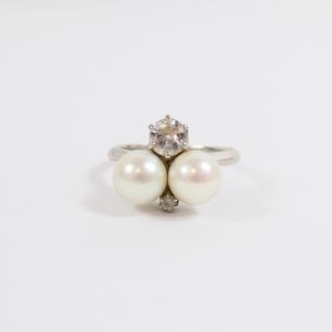 300 / 400 €Bague trèfle : en or gris 750 mil. Ornée de deux perles de culture et d'un diamant taille ancienne d'environ 0,35 carat. Travail français. (Largeur : 1,2 cm environ) (TDD : 54) (salissures). 5,5 g. brut.