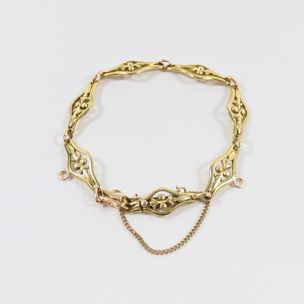 800 / 900 €Bracelet : en or 750 mil. À maille filigranée. Fermoir cliquet à maille de sécurité. (Longueur : 18,5 cm environ) (Transformations, manque une chaîne de sécurité). 14,7 g.