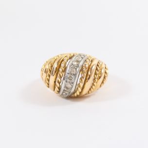 500 / 600 €Bague dôme godronnée : deux ors 750 mil. À chaton alterné de torsades et de godrons et centré d'une ligne de diamants taille rose et d'un brillanté. (TDD : 54) (Trace de mise à taille)/ 9,2 g. brut.