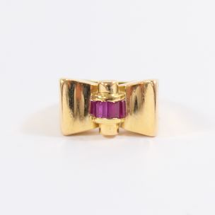 400 / 500 €Bague TANK : en or 750 mil. Centrée de pierres imitation rouges. (Largeur : 0,9 cm environ) (TDD : 48/49). 7,3 g. brut.
