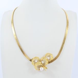 1 700 / 1 900 €Collier : en or 750 mil. À maille souple centrée d'un motif serti de perles de Cultures (Diam. : 4 mm à 6,5 mm environ). Fermoir cliquet à huit de sécurité. (Longueur : 43,5 cm environ) (fermoir déformé). 31,7 g. brut.