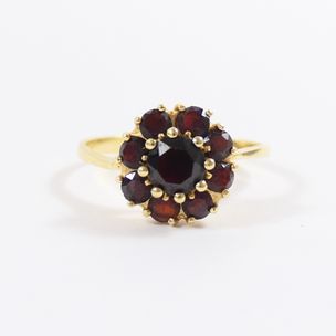 150 / 200 €Bague fleur : en or 750 mil. Ornée de grenats sertis griffe. (TDD : 54). 2,7 g. brut.