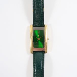 80 / 120 €LIP : montre sur bracelet. Boîtier rectangulaire en acier et métal doré, à lunette lisse (Dim. : 2 x 3,5 cm environ). Cadran vert à chiffre romains. Mouvement à quartz. Bracelet en cuir vert à boucle ardillon en métal doré. (Tour de poignet : de 15 à 19 cm environ).