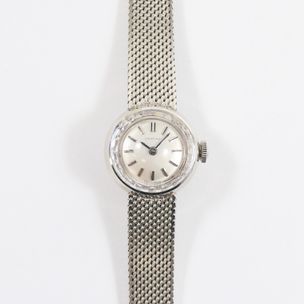 1 200 / 1 400 €CERTINA : Bracelet-montre en or gris 750 mil. Boîtier rond à lunette lisse. Cadran argenté à index appliqués. Mouvement mécanique à remontage manuel. Signé et numéroté. Bracelet en or 750 mil. À maille polonaise. Fermoir échelle à gradin. (Tout de poignet : 16 cm environ) (Manque chaînette de sécurité). 32 g. brut.