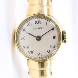 1 100 / 1 300 €ETERNA : Montre bracelet en or 750 mil. Cadran rond à lunette lisse, cadran crème à chiffres romains, mouvement mécanique à remontage automatique. Bracelet jonc à chaînette de sécurité. (Tour de poignet : environ 15 cm). 26,1 g. brut.