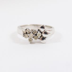 140 / 200 €Bague : en or 585 mil. Ornée d'un motif floral serti de diamants brillantés. (Largeur : 0,8 cm environ) (TDD : 52). 3,8 g. brut.
