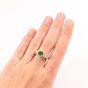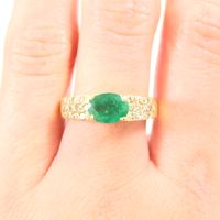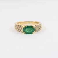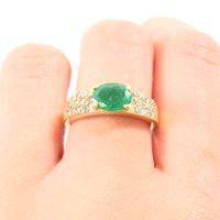 Bague jonc : en or 750 mil. Centrée d'une émeraude ovale sertie griffe épaulée d'un pavage de diamants brillantés. (TDD : 56) (trace de mise à taille). 5,7 g. brut.