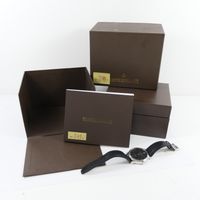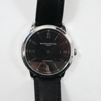 BAUME & MERCIER : "Classima", montre sur bracelet. Boîtier rond à lunette lisse. (Diam. : 43 mm environ). Cadran noir à chiffres romains et index. Guichet dateur à 3 h. Mouvement mécanique à remontage automatique. Ref : 65832. Signée et numérotée. Avec boîte et écrin.