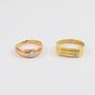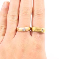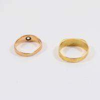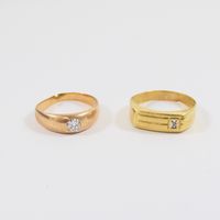 Deux bagues : en or 750 mil. L'une ornée d'un diamant taille ancienne d'environ 0,3 carat. Et l'autre ponctuée d'un petit diamant 16/16 (éclat). (TDD : 56 et 61) (déformation). 7 g. brut.