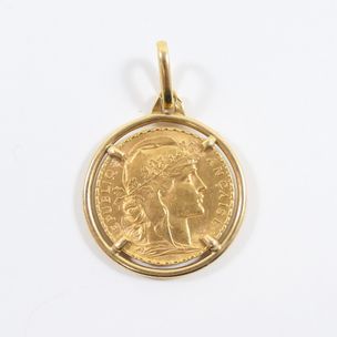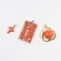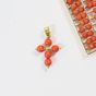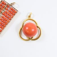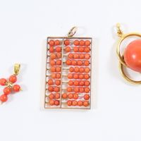 Lot de trois pendentifs : en or 750 mil. Un formant un boullier ornée de corail. (Longueur : 4,5 cm environ). Un pendentif croix ornée de billes de corail (Longueur : 2,7 cm environ). Un pendentif orné d'un cabochon de corail. (Diam. : 1,7 cm environ). Travail français. (Longueur : 3,5 cm environ). 21,5 g. brut.