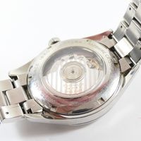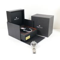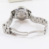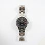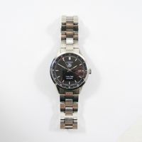 TAG HEUER : modèle "Carrera Twin-Time". Bracelet-montre Ref. : WV2115-0. Boîtier rond en acier et lunette lisse (Diam. : 40 mm), cadran noir à index appliqués, guichet dateur à 3 H. Mouvement mécanique à remontage automatique. Calibre 7. Fond squelette. Signé et numéroté. Bracelet en acier à boucle déployante. (Tour de poignet : 19 cm environ). Avec boîte, sur boîte, 3 maillons supplémentaires.