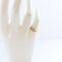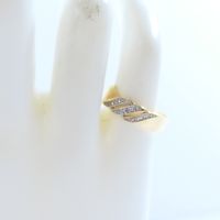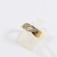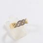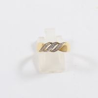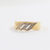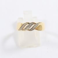 Bague en or 375 mil ajouré centrée de "virgules" ornées de diamants 8/8 (Larg : 5 mm ; TDD : 53, anneau légèrement déformé). 1,5 g brut.