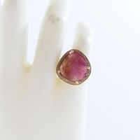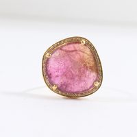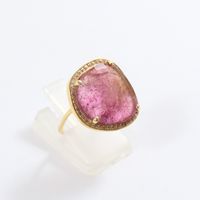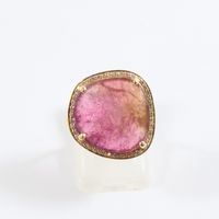 Bague en or 750 mil centrée d'une pierre fine rosée facettée (égrisures) entourée de diamants (Dim approximative du chaton : 1,7 x 1,8 cm environ ; TDD : 50, anneau à redresser). 3,8 g brut.