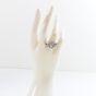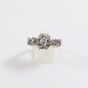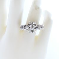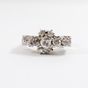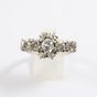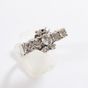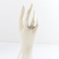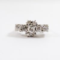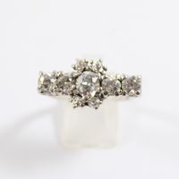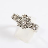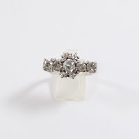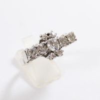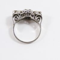 Bague en or gris 585 mil et platine 850 mil barrée d'une ligne de diamants TA et de 4 diamants bordant le prinicpal de la ligne (Long chaton : 2,3 cm ; Larg : 1,2 cm environ ; TDD : 60). 7,7 g brut.