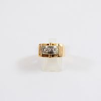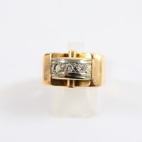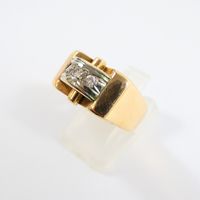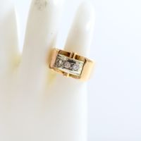 Bague pont en or 750 mil barrée d'une ligne de 3 diamants (1 brillantés et 2 8/8 dont 1 accidenté) (Larg : 1,1 cm ; TDD : 51,5). 5 g brut.