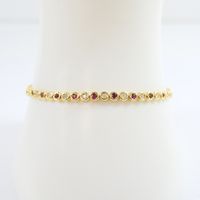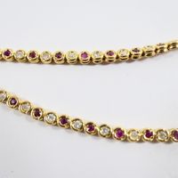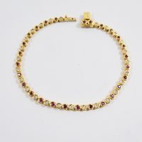 Bracelet chenille en or 750 mil orné de diamants alternés de rubis dans des sertis à godron (Larg : 3 mm ; Long : 17,5 cm). 7,4 g brut.