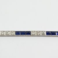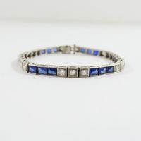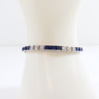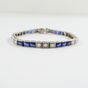 Bracelet ligne en or gris 750 mil et platine 850 mil orné d'une ligne de 3 diamants dans des chatons carrés intercalés de 3 saphirs facettés taille fantaisie (égrisures) (chatons rectangulaires) (Larg : 4 mm ; Long : 15,5 cm environ). 12,6 g brut.