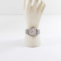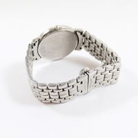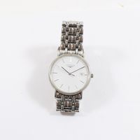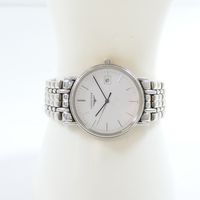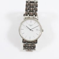 Bracelet-montre en acier, boîtier rond (Diam : 33 mm), cadran blanc à index bâton et guichet dateur, tour de bras à maillons acier articulés (Long : 18 cm environ), LONGINES "Présence" mouvement quartz.