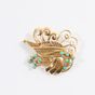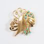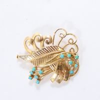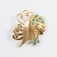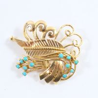 Broche en or 750 mil ajouré figurant un végétal rehaussé de cabochons de turquoise (1 pierre égrisée) (Dim : 3,8 x 3,5 cm environ). 10,7 g brut.