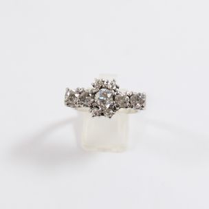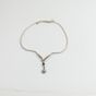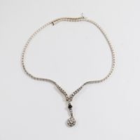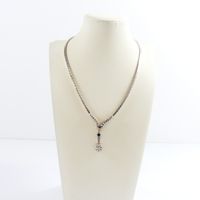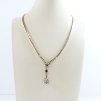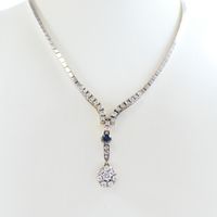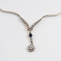 Collier en or gris 585 mil à maillons briquette articulés centré d'une ligne de diamants, d'un saphir et retenant en pampille une fleur diamantée (Larg maillon : 2,5 mm ; Long collier : 43 cm environ ; Diam pendent fleur : 1 cm environ). 25,1 g brut.