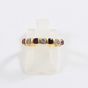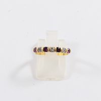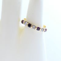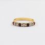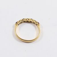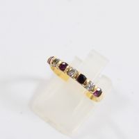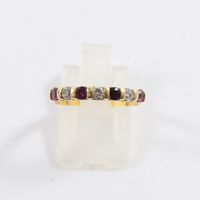 Demi-alliance en or 750 mil ornée d'une ligne alternée de diamants et rubis (Larg : 2 mm ; TDD : 52). 2,1 g brut.