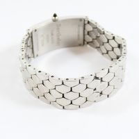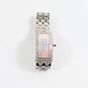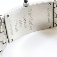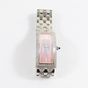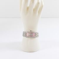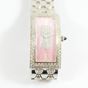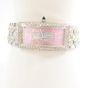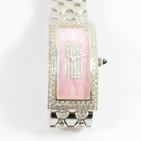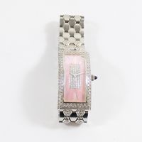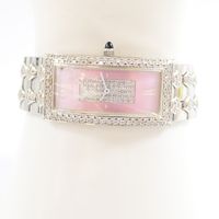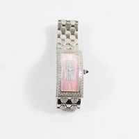 E) Art 524 bis du CGI al c : Bracelet-montre de dame en or gris 750 mil avec le fond acier, boîtier rectangulaire incurvé (Dim : 38 x 20 mm environ) à lunette diamantée, cadran rose à chiffres romains centré d'un pavage de diamants, tour de bras acier à maillons losangique (6 d'entre eux diamantés ; Long : 16,5 cm environ), BARTHELAY "Ladybird" mouvement quartz (verre accidenté, à remplacer).