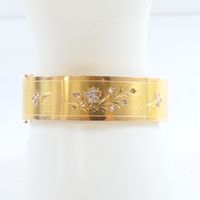 Large bracelet rigide ouvrant en or 750 mil guilloché d'un motif floral rehaussé de roses (manque 2 pierres) (Larg : 1,8 cm ; Diam intérieur : 5,1 x 5,9 cm environ) (Petits chocs). 21 g brut.