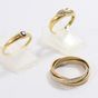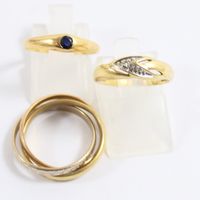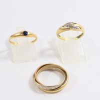 Lot de 3 bagues en or 750 mil : 1 triple (TDD : 52), 1 centrée d'un saphir (TDD : 52) et 1 ajourée ornée d'un diamant 8/8 (TDD : 49). 9,3 g brut.