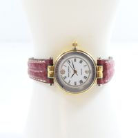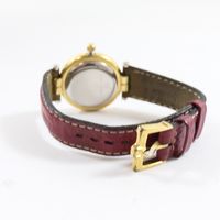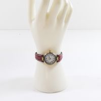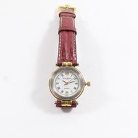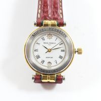 Montre de dame en acier et métal doré sur bracelet cuir usagé, boîtier rond (Diam : 26 mm), cadran blanc à chiffres romains et guichet dateur à 6h, MICHEL HERBELIN "Newport" mouvement quartz (boucle ardillon en métal doré siglée)