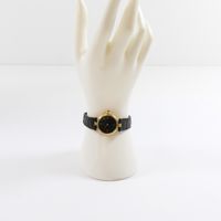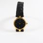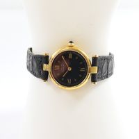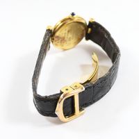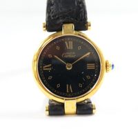 Montre de dame en argent doré 925 mil sur bracelet cuir usagé, boîtier rond (Diam : 24 mm) à large lunette, cadran noir à chiffres romains et index losangique, MUST de CARTIER "Vendôme" mouvement quartz (boucle déployante signée) (Usures). 22,4 g brut.