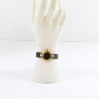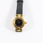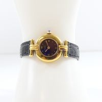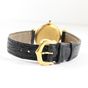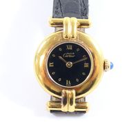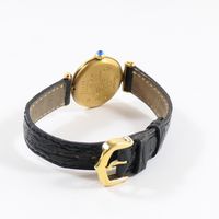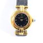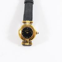 Montre de dame en argent doré 925 mil sur bracelet cuir usagé, boîtier rond (Diam : 24 mm) à large lunette et attaches à double godron, cadran noir à chiffres romains et index losangique, MUST de CARTIER "Colisée" mouvement quartz (boucle ardillon siglée en métal doré). 19,9 g brut.