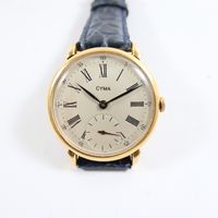 Montre d'homme en or 750 mil sur bracelet cuir usagé, boîtier rond (Diam : 36 mm), cadran argenté à chiffres romains et petite seconde, CYMA mouvement mécanique (boucle ardillon métal doré). 38,9 g brut.
