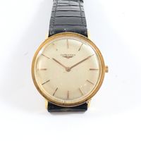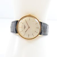 Montre en or 750 mil sur bracelet cuir usagé, boîtier rond (Diam : 33 mm), cadran argenté guilloché à index bâton, LONGINES, mouvement mécanique. 30 g brut.