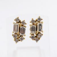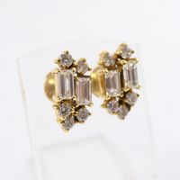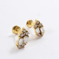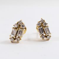 Paire de boucles d'oreilles en or 750 ornées de 2 diamants baguette rehaussés de 5 diamants ronds brillantés (Dim : 1,5 x 0,8 cm environ) (1 système Alpa à changer). 5,1 g brut.
