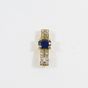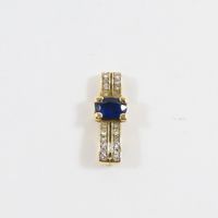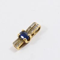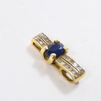 Pendentif barette en or 750 mil orné de 2 lignes de diamants et rehaussé d'un saphir ovale facetté (Dim : 1,8 x 0,4 cm) (Salissures). 1,9 g brut.