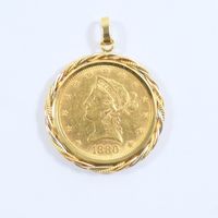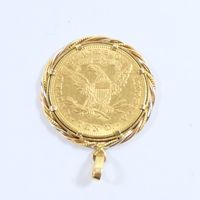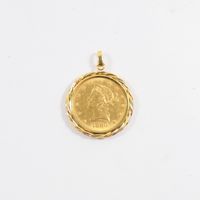 Pendentif en or 750 mil orné d'une pièce de 10 US dollar en or 900 mil (Diam : 32 mm). 21,1 g.